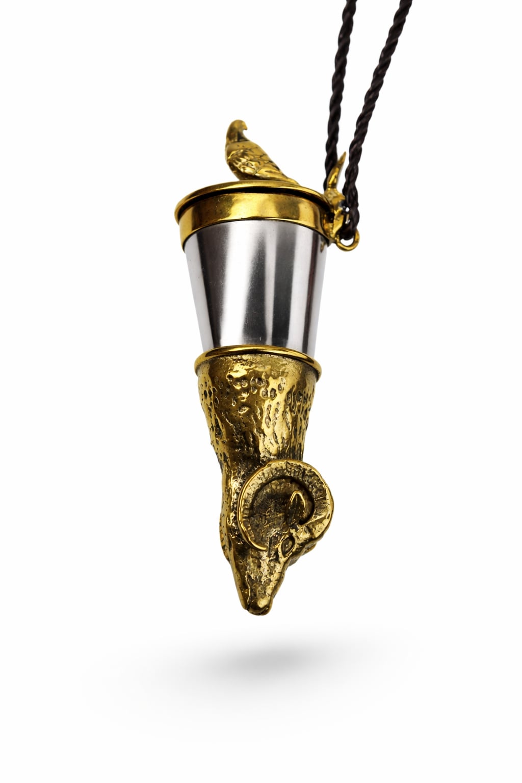 Elegancka kulawka wykonana z wysokiej jakości mosiądzu oraz stali nierdzewnej kwasoodpornej, zaprojektowana z myślą o myśliwych i miłośnikach dzikiej przyrody, którzy cenią kunszt wykonania i wyraziste symbole lasu. Wieczko zdobi precyzyjnie odwzorowany wizerunek jastrzębia – ptaka symbolizującego czujność, determinację i ostre spojrzenie, idealne cechy dla pasjonatów łowiectwa. Róg kulawki ozdobiony jest detalicznie wykonanym łbem barana z dużymi, zaokrąglonymi rogami po bokach, co nadaje całości siły i majestatu oraz podkreśla tradycyjny charakter tegoż przedmiotu.