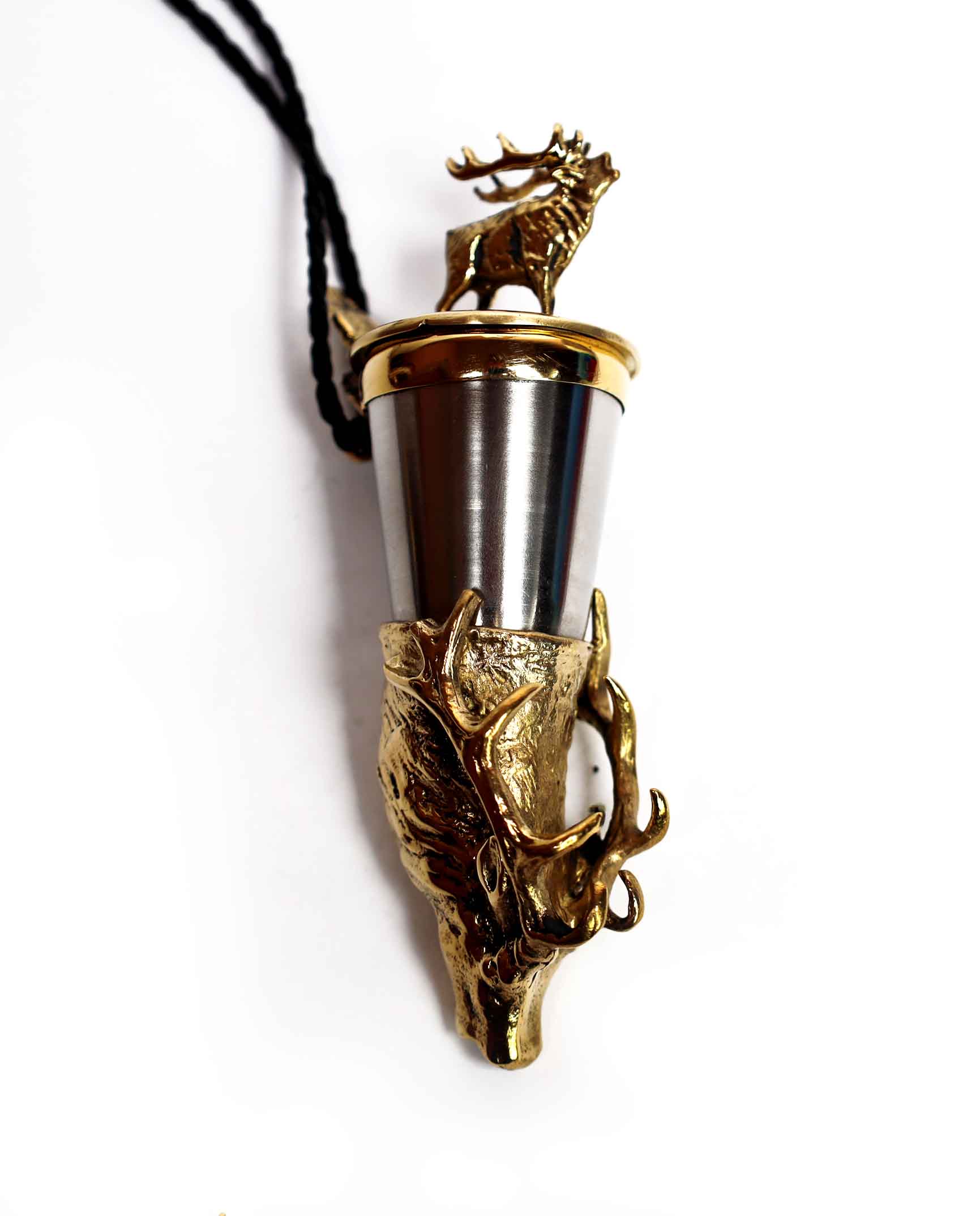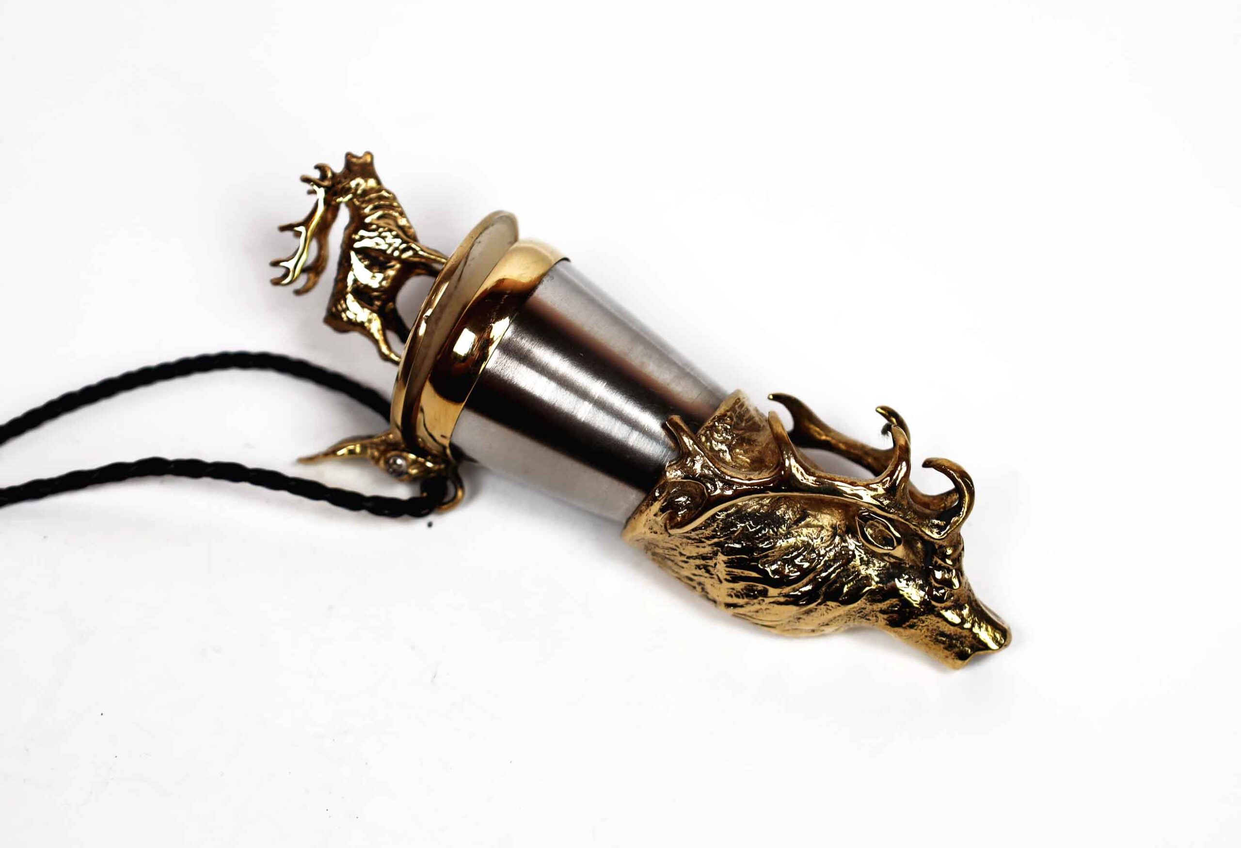 Efektowna kulawka wykonana z mosiądzu i stali nierdzewnej kwasoodpornej, będąca prawdziwym hitem wśród miłośników lasu, dzikiej przyrody i wspólnych biesiad. Wieczko zdobi sylwetka jelenia wraz z motywem wyjącego byka – symbol potęgi, wolności i pierwotnego ducha natury, natomiast róg zwieńczony jest figurą byka, podkreślającą siłę i majestat leśnego króla.