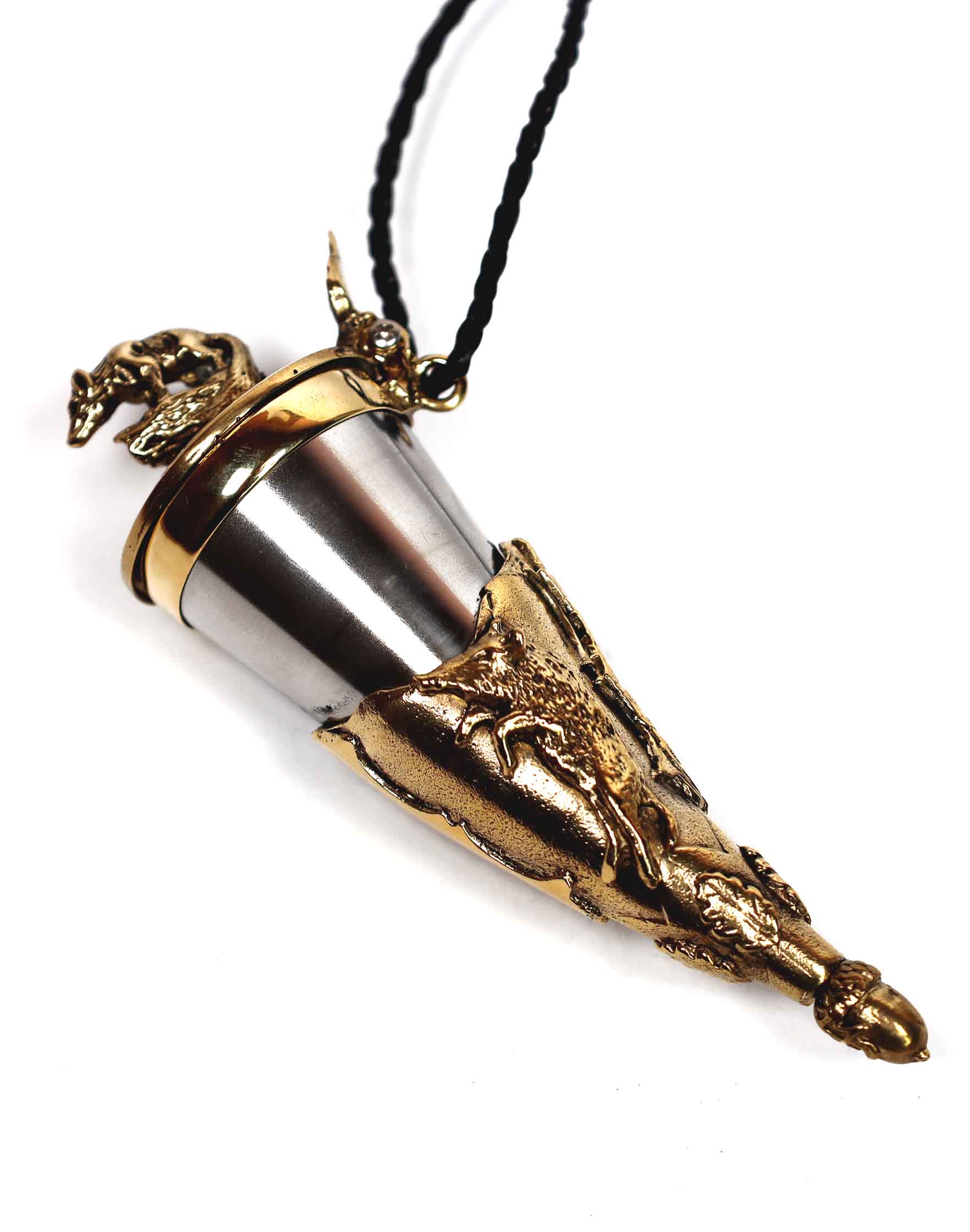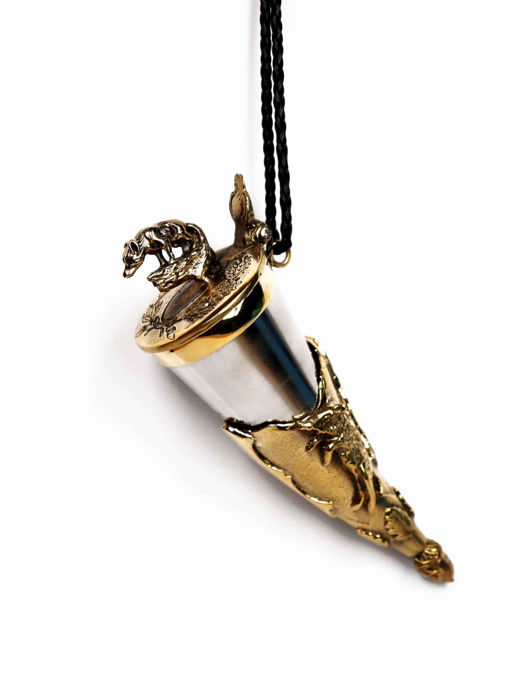 Oryginalna kulawka wykonana z mosiądzu oraz stali nierdzewnej kwasoodpornej, inspirowana dziką naturą i klimatem leśnych spotkań. Róg zdobią płaskorzeźby zwierząt, tworzące dynamiczną opowieść o życiu w lesie, natomiast wieczko zwieńczone jest figurą kojota – symbolu sprytu, wytrwałości i wolności.