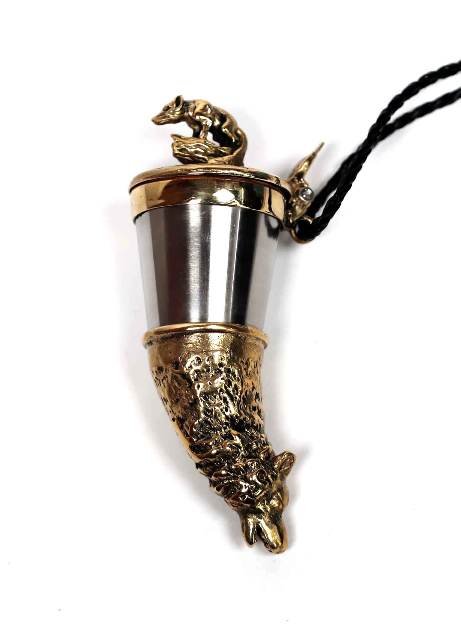 Wyjątkowa kulawka wykonana z mosiądzu oraz stali nierdzewnej kwasoodpornej, inspirowana dziką przyrodą i klimatem leśnych wędrówek. Wieczko zdobi wizerunek kojota – symbol sprytu, wytrwałości i niezależności, natomiast róg zwieńczony jest figurą wilka, podkreślającą siłę, instynkt i dziki charakter lasu.