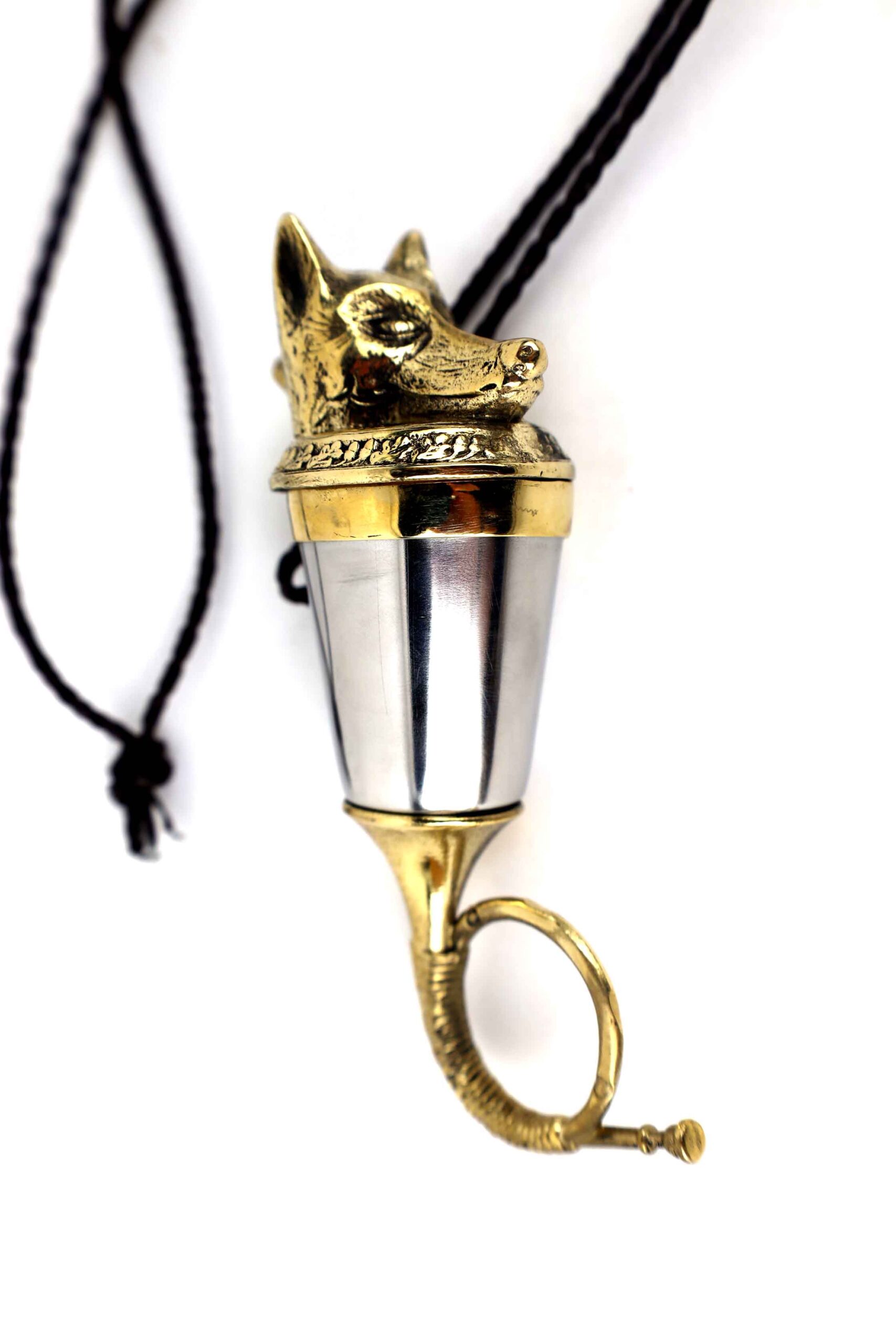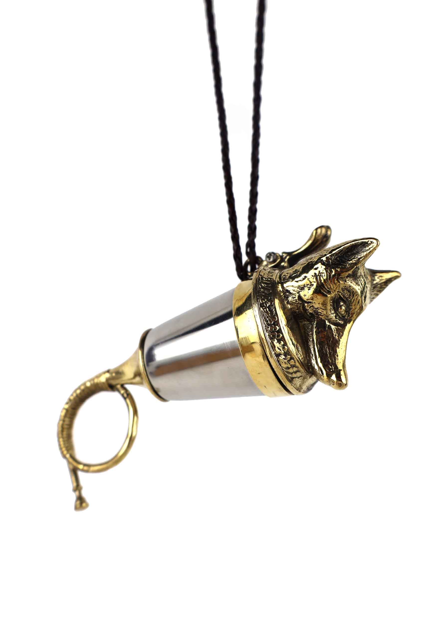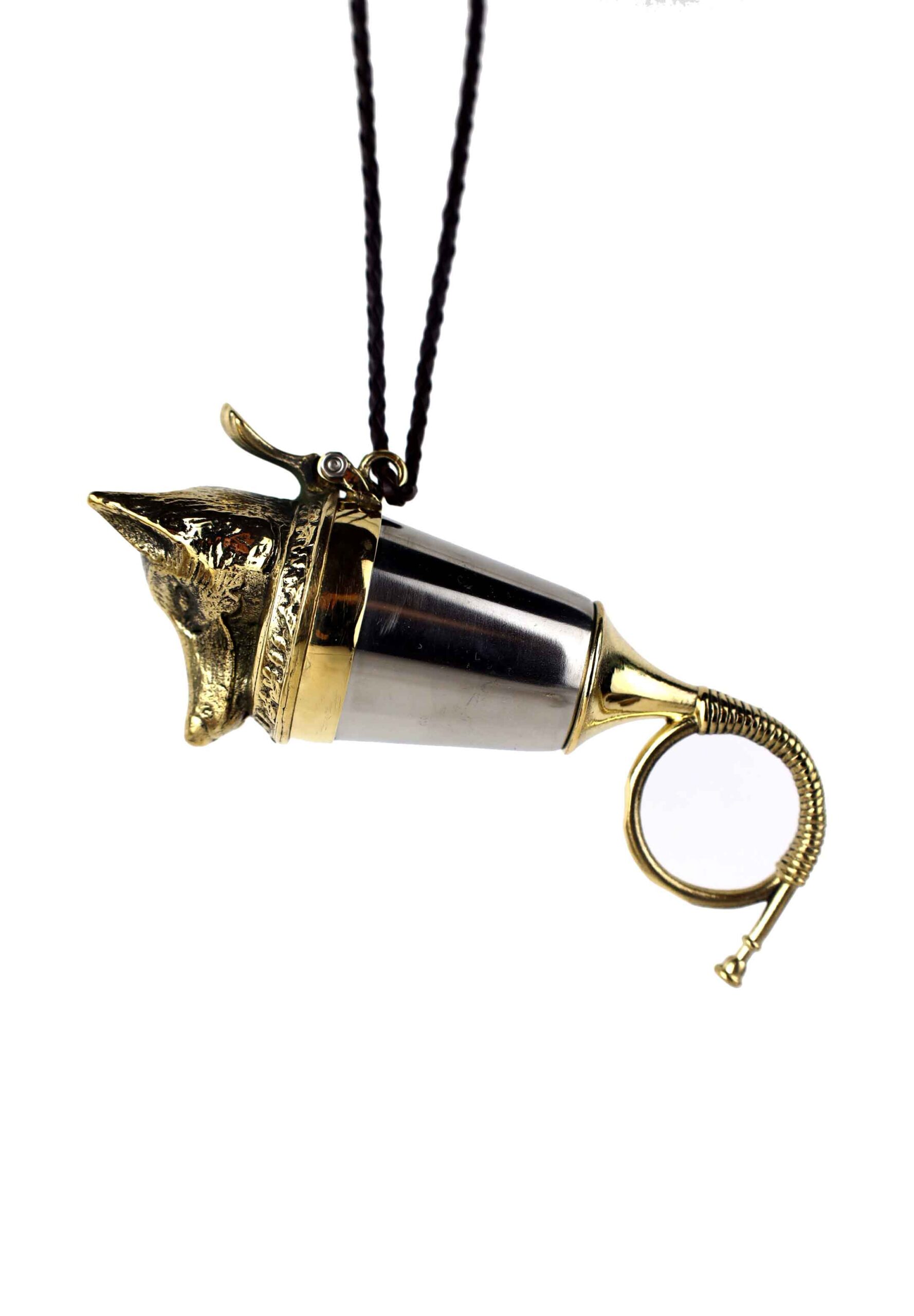 Elegancka kulawka wykonana z wysokiej jakości mosiądzu oraz stali nierdzewnej kwasoodpornej, zaprojektowana z myślą o pasjonatach polskich lasów. Wieczko zdobi starannie rzeźbiona głowa lisa – jednego z najbardziej charakterystycznych przedstawicieli dzikich zwierząt. Róg kulawki zwieńczony jest motywem trąbki sygnałówki, nawiązującym do tradycji myśliwskich.