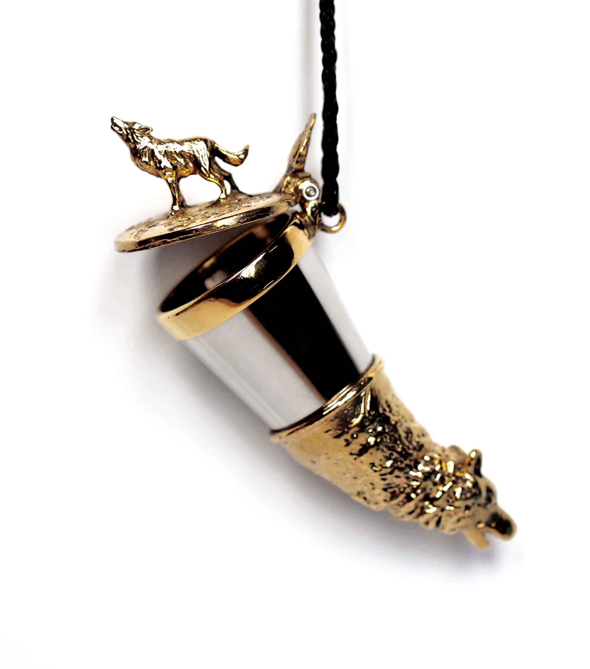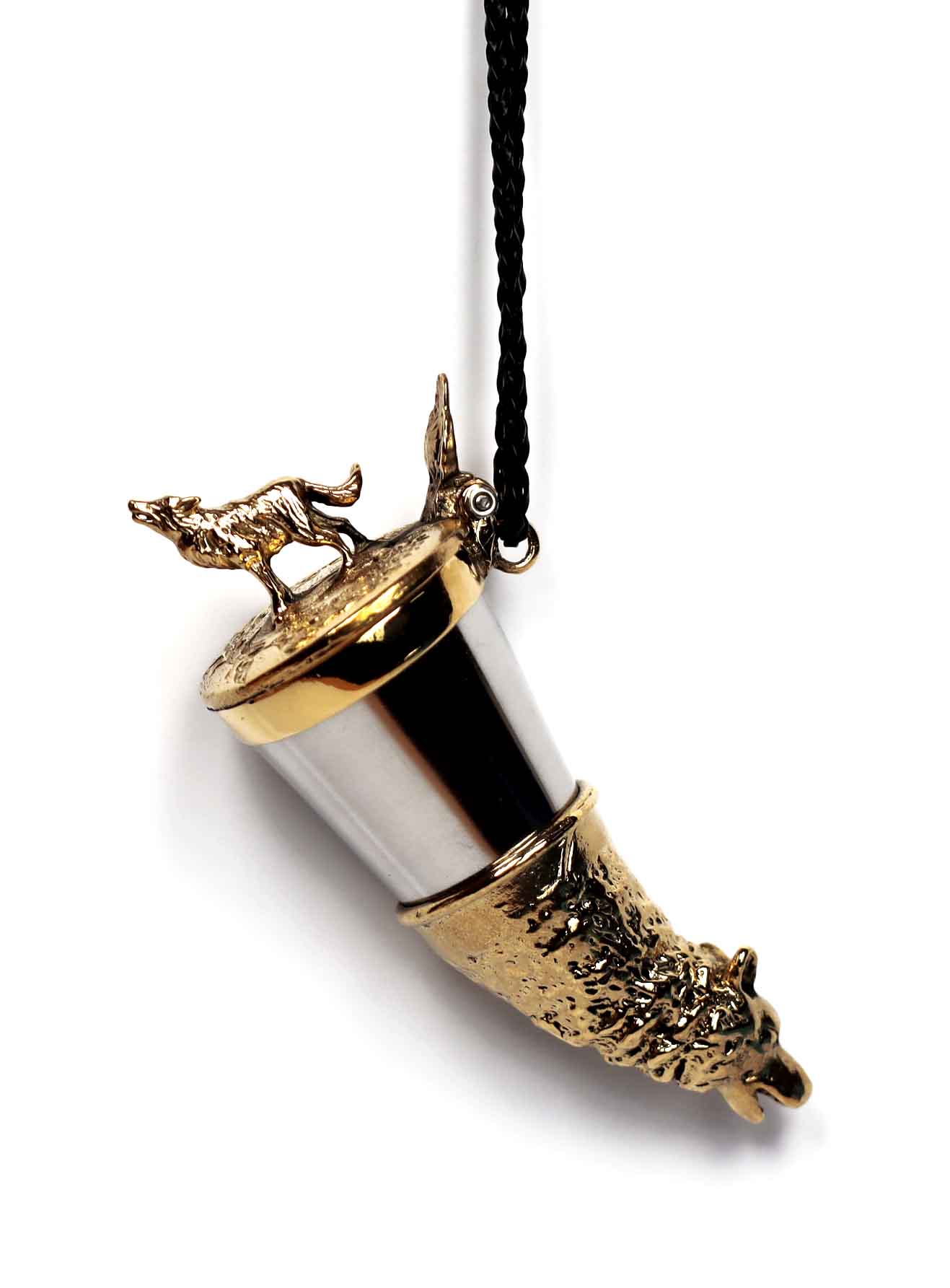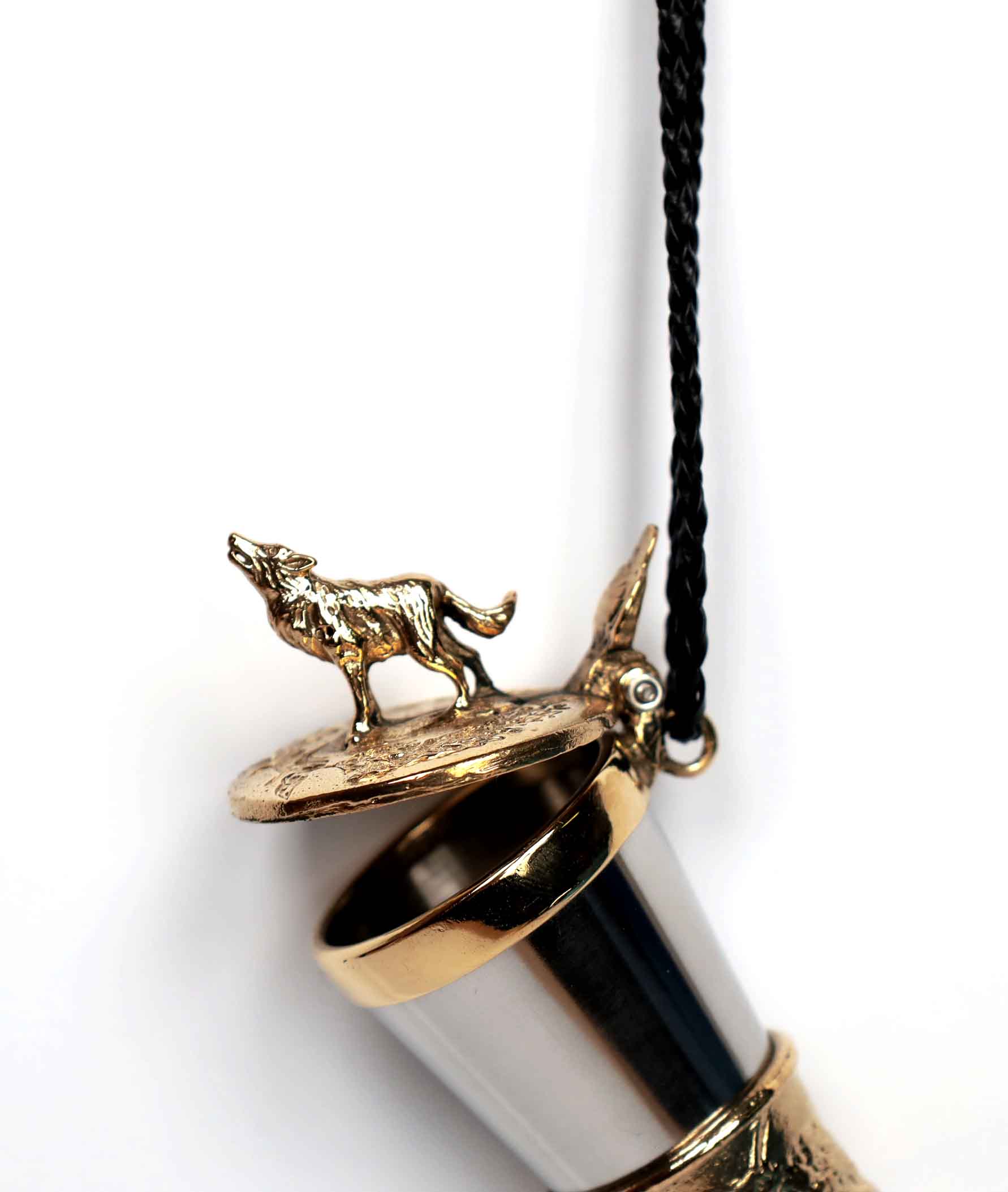 Wyjątkowa kulawka wykonana z mosiądzu i stali nierdzewnej kwasoodpornej, stworzona z myślą o miłośnikach lasu, dzikiej przyrody i symboliki drapieżników. Wieczko zdobi wizerunek wilka – symbol siły, czujności i niezależności, natomiast róg zwieńczony jest torsem wilka, podkreślającym majestat i dziki charakter tego strażnika lasu.