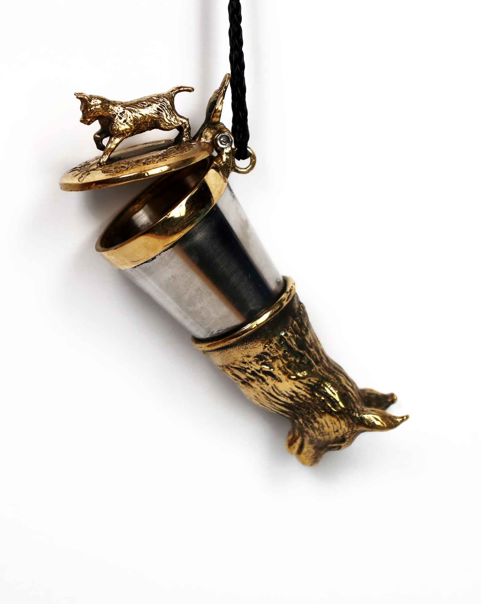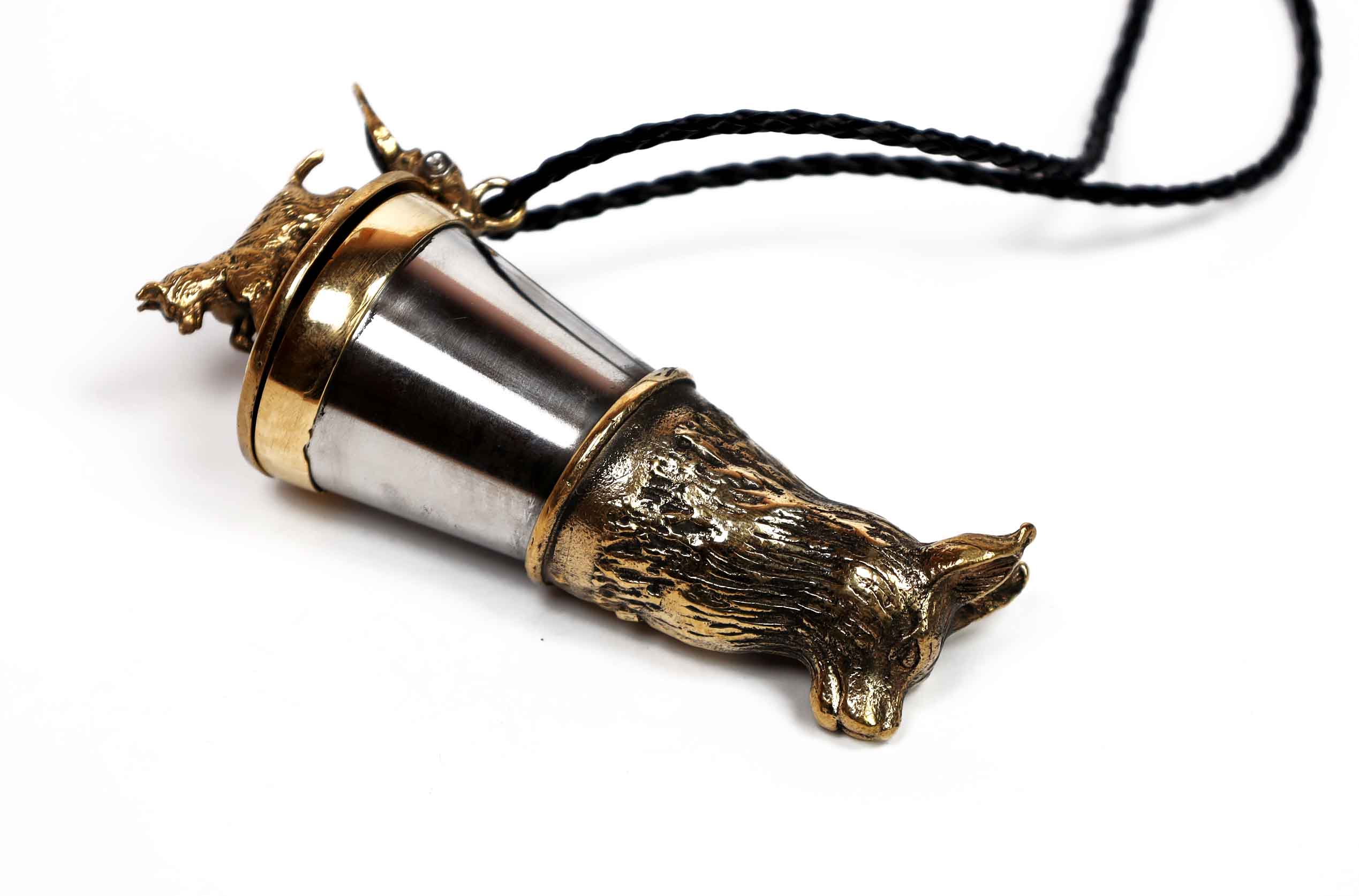 Elegancka kulawka wykonana z mosiądzu i stali nierdzewnej kwasoodpornej, stworzona z myślą o miłośnikach lasu, dzikich zwierząt i wspólnych uczt na łonie natury. Wieczko zdobi wizerunek szczeniaka – symbol lojalności i początku łowieckiej drogi, natomiast róg ozdobiony jest motywem rysia, podkreślającym czujność, niezależność i dziki charakter leśnych ostępów.