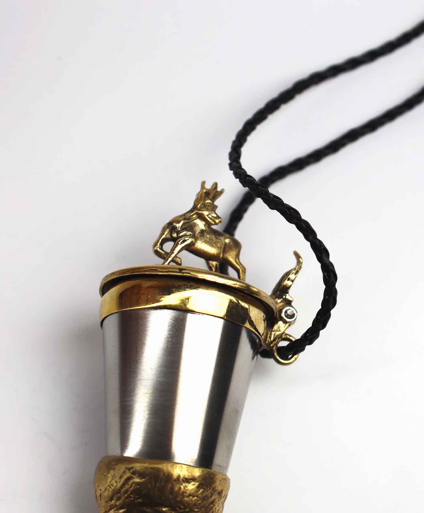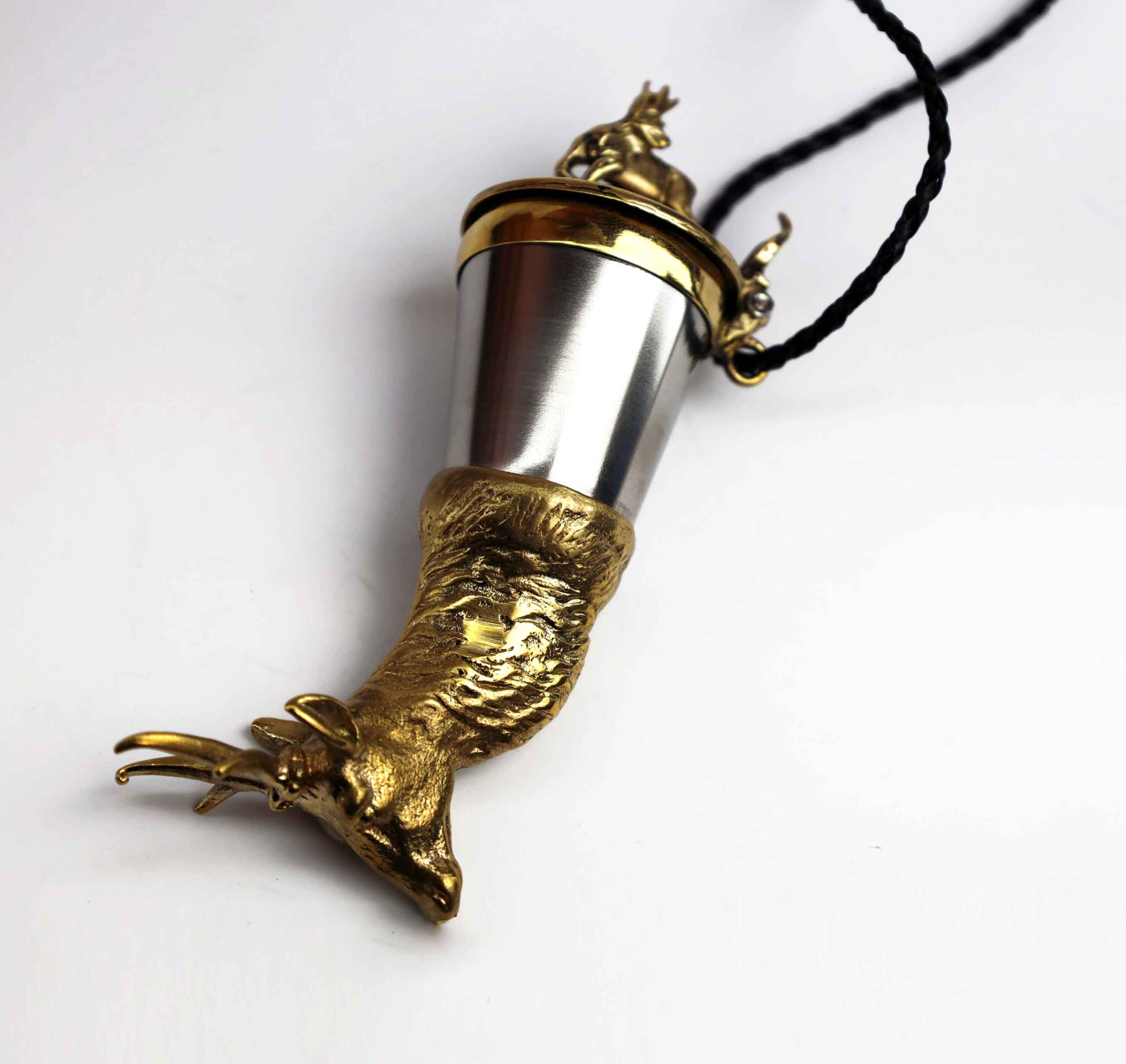 Elegancka kulawka wykonana z mosiądzu i stali nierdzewnej kwasoodpornej, stworzona z myślą o miłośnikach lasu, dzikiej przyrody i wspólnych uczt na łonie natury. Wieczko zdobi wizerunek samca sarny – symbolu czujności, delikatności i harmonii z naturą, natomiast róg ozdobiony jest motywem kozła, podkreślającym siłę, wytrwałość i niezależność.