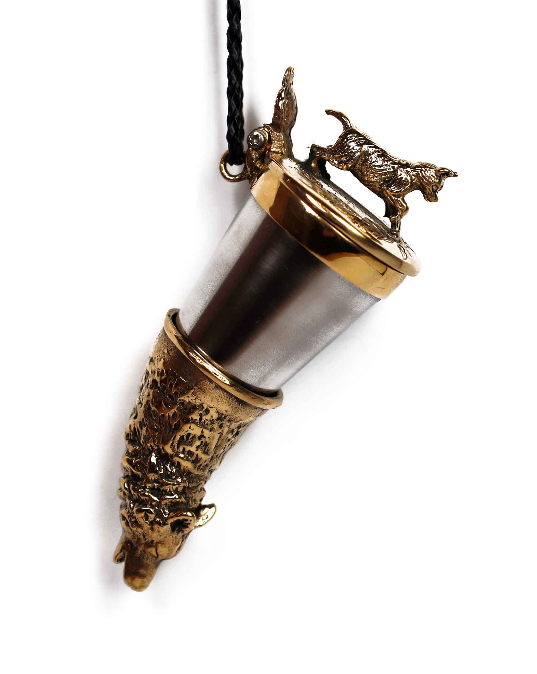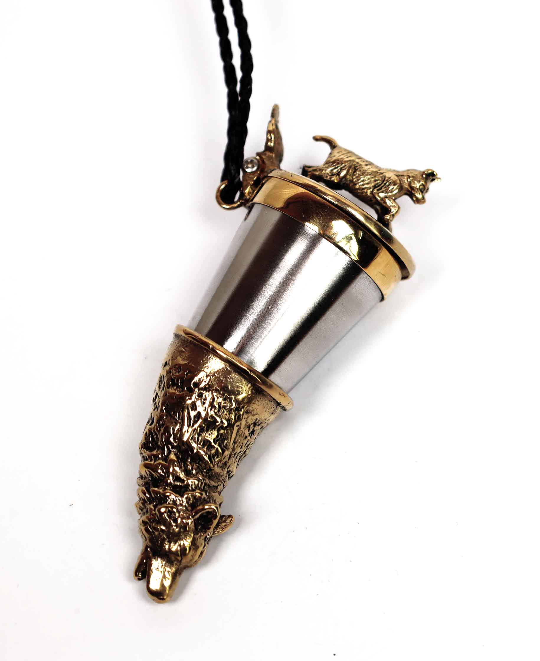 Elegancka kulawka wykonana z mosiądzu i stali nierdzewnej kwasoodpornej, zaprojektowana dla miłośników łowiectwa i natury. Wieczko zdobi wizerunek szczeniaka – symbol lojalności i początku łowieckiej drogi, natomiast róg ozdobiony jest figurą wilka, podkreślającą siłę i dziki charakter.